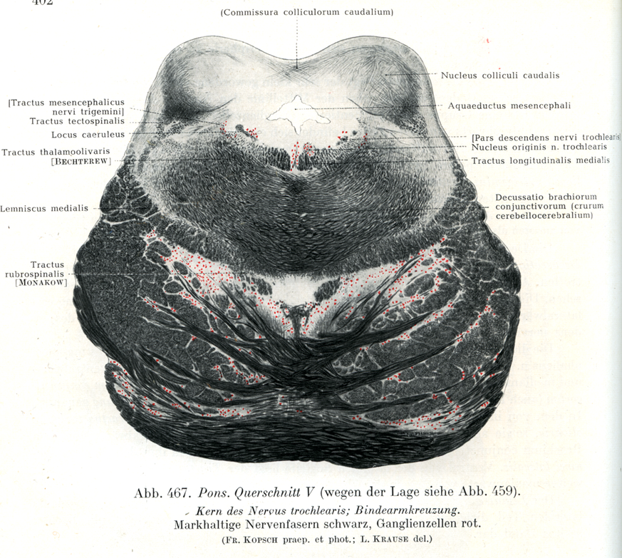 結合腕交叉はすでに終わっている.その交叉を終えた線維束は被蓋のなかで正中線のすぐそばに円味を帯びた索をなして集まっている.この線維群の背方には両側に内側縦束があり,内側縦束のさらに背方でその線維束のあいだに動眼神経核Nucleus originis nervi oculomotoriiの細胞群がある.動眼神経の根線維は内側縦束の線維束のあいだを通り,結合腕を貫いて,外側に凸の弓を画いて腹方にすすみ,動眼神経溝に達する.視床オリーブ路は相変らずその場所にあり,内側毛帯の位置はさらに側方に移り,視蓋脊髄路は背方にある.
