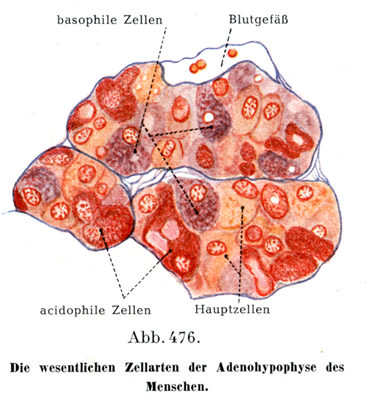 酸好性細胞は成長ホルモンを,塩基好性細胞は生殖腺刺激ホルモンを分泌するという.腺緬胞の集りは血管をもつ疎性結合組織によって包まれている.血管は内腔が広くて,壁が薄い.