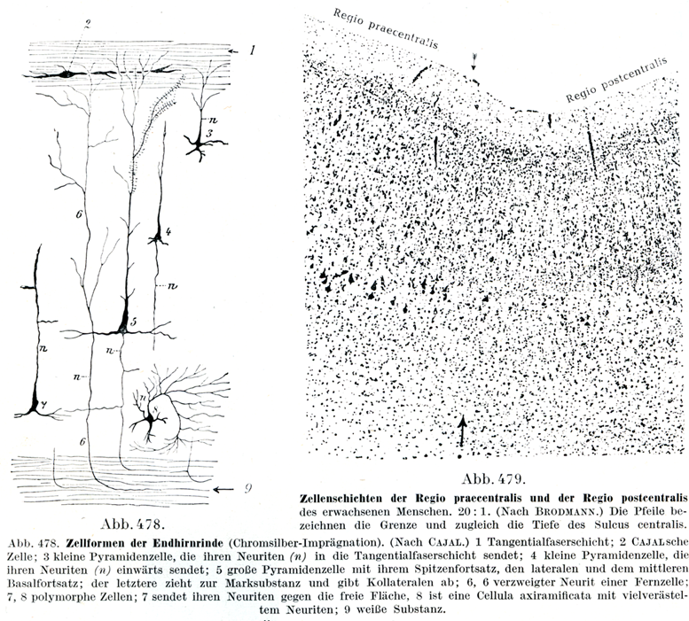 1切線線維層;2 カハール細胞Cajalsche Zelle;3 小錐体細胞,その神経突起(n)を切線線維層に送っている;4 小錐体細胞,その神経突起(n)を脳の内方部に送っている;5 大錐体細胞とその尖端突起,側方と中央の底突起Basalfortsatz;底突起は髄質に達し,また側枝を出している;6, 6 遠くにある細胞の神経突起が枝分れしている;7,8 多形細胞;7は神経突起を脳の表面に向かって送る,8は多数の枝に分れた神経突起をもつ軸分枝細胞;9 白質.