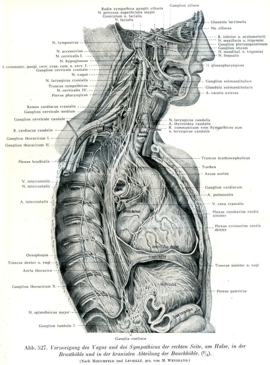 [図527]右側の迷走神経と交感神経の頚部,胸腔および腹腔の上部における分枝(2/5) (HirschfeldおよびLeveilléによる)
