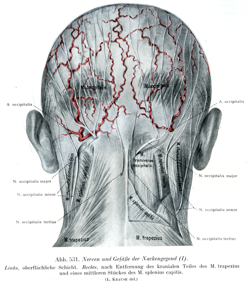 [図531]項部の神経と血管(I) 左側は表層.右側は僧帽筋の上部と項板状筋の中央部とを取り去ってある.