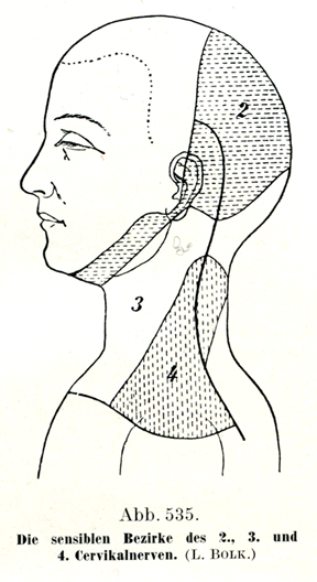 [図535]第2,第3,第4頚神経の知覚線維の分布領域 (L. Bolk)
