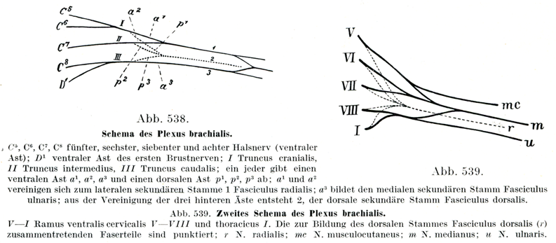 [図539]腕神経叢のもう1つ別の模型図 V~1第5~第8頚神経と第1胸神経との前枝.後方の幹である背側神経束(r)を形成するために集まる線維束は点絵で示してある;r 橈骨神経;mc 筋皮神経;m 正中神経;u 尺骨神経.