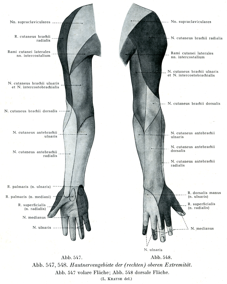 [図547, 548](右の)上肢の皮神経の分布領域 図547は掌側面; 図548は背側面.