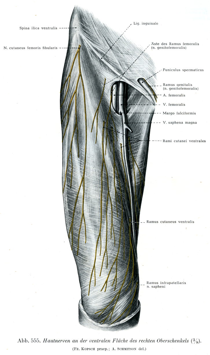 右の大腿の前面における皮神経