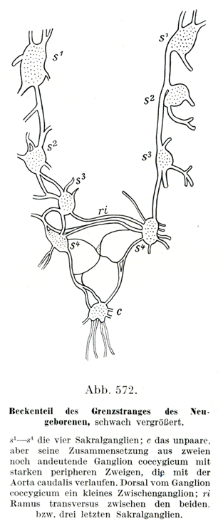 [図572]新生児の交感神経幹の骨盤部 弱拡大.s1~s4 4個の仙骨神経節;c 対をなしてはいないが,なお2つの神経節が合したものであることを暗示している尾骨神経節とそれから末梢へ出るかなり太い枝,これは尾動脈に伴なって走る.尾骨神経節の背方には小さい介在神経節が1つある;ri 最下部の2個ないし3個の仙骨神経節のあいだを結ぶ横枝.