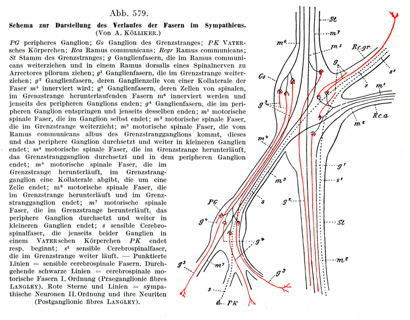 PG 末梢の神経節;Gs交感神経幹の神経節;PK ファーテル層板小体;Rca(白)交通枝;Rcgr (灰白)交通枝;St交感神経幹の幹;g神経節からの線維Ganglienfasernで,交通枝のなかをすすんで,脊髄神経の後枝をへて立毛筋に達するもの;g1神経節からの線維で,交感神経幹の中をさらに走ってゆくもの;g2神経節からの線維で,その起りをなす神経細胞は線維m5の1側枝によって支配されている;g3神経節からの線維で,その起りをなす細胞は交感神経幹の中を下行する脊髄神経の線維m6によって支配され,末梢の神経節のさらに向うで終わっている;g4神経節からの線維で,これは末梢の神経節で起り,それより末梢の方で終わっている;m1脊髄性の運動線維,これは脊髄神経節そのもののなかで終る;m2脊髄性の運動線維,これは交感神経幹の中をさらに進む;m3脊髄性の運動線維,これは[交感]幹神経節の白交通枝Ramus communicans albusから来て,幹神経節と末梢の神経節を通過して,さらに進みいっそう小さい神経節で終る;m4脊髄性の運動線維,これは交感神経幹の中を下行し,[交感]幹神経節を通過して,末梢の神経節で終る;m5脊髄性の運動線維,これは交感神経幹のなかを下行し,幹神経節の中で1本の側枝をだし,この側枝は1個の細胞のまわりに終る;m6脊髄性の運動線維,これは交感神経幹の中を下行し,幹神経節の中で終わっている;m7脊髄性の運動線維,これは交感神経幹の中を下行し,末梢の神経節を通過してさらに進み,いっそう小さい神経節で終わっている;s 知覚性の脳脊髄神経線維,これは両神経節(脊髄神経節と[交感]幹神経節)より末梢で1個のファーテル層板小体PKのなかで終る(ここで始まるという方がよい);s1 知覚性の脳脊髄神経線維,これは交感神経幹の中をさらに進む.--点線=知覚性の脳脊髄神経線維.神経節のなかを通過する黒い線=脳脊髄神経の1次運動線維(節前線維Langley).赤い星印と赤い線=交感神経の2次ニューロンとその神経突起(節後線維Langley).