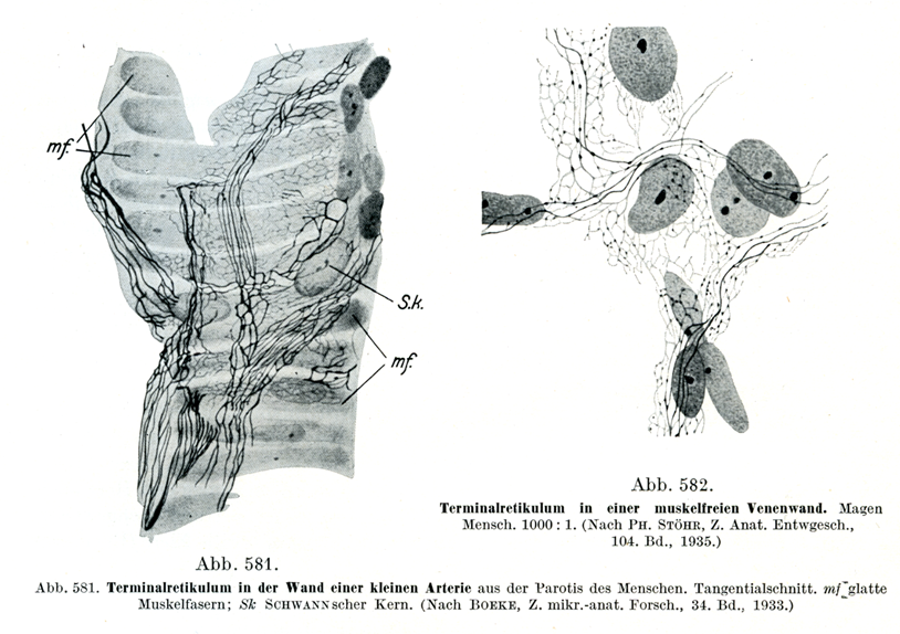 [図582]筋層のない静脈壁における終末細網 ヒトの胃. ×1000 (Ph. Stöhr, Z. Anat. Entwgesch.,104. Bd.1935による)