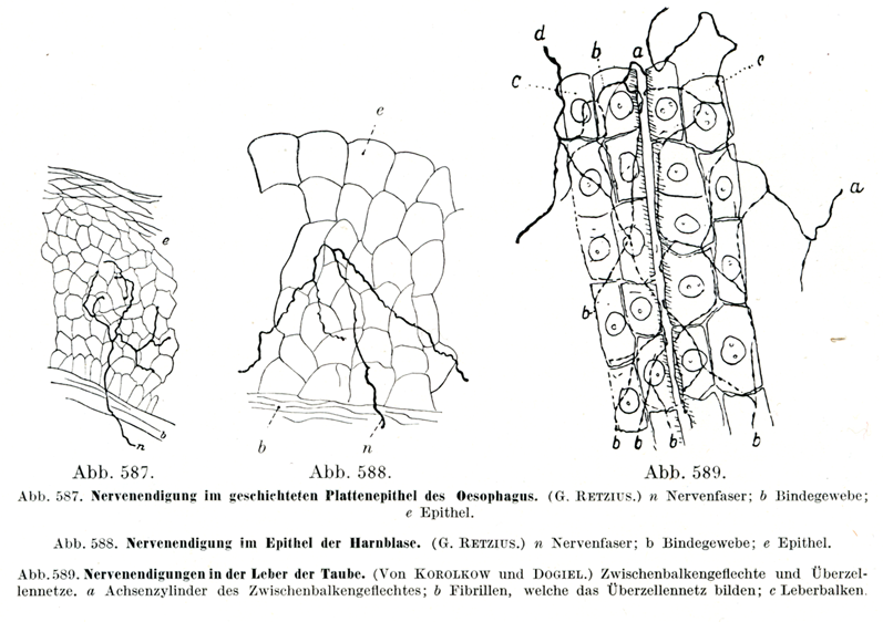 [図587]食道の重層扁平上皮における神経終末(G. Retzius) n 神経線維;b 結合組織;e 上皮.