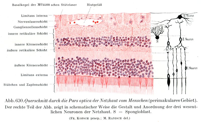 網膜の外方の主要部ともいえるこの上皮性の部分につづいて,内方の主要部がまず外網状層äußere, retikuldire Schichtをもってはじまる.外網状層の内方には,それよりずっと厚い内顆粒層innere Körnerschichtが続き,さらにその内方に内網状層innere retikuläre Schichtがある.その次には多極性の大きい神経細胞の層がある.これは神経細胞層Ganglienzellenschichtとよばれて,網膜のたいていの場所では単層である.最後に色のうすい視神経線維の集まった層があり,この層は乳頭から鋸状縁へと次第にうすくなっている.これが神経線維層Nervenfaserschichtである.網膜はその硝子体に向かった内面を内境界膜Membrana limitans internaという特別の膜で境されている.第2の主要部(内方の主要部)は神経上皮(外方の主要部)に対して網膜の脳層Cerebralschichtともよばれる.神経上皮は脳室の上衣Ependymに相当し,脳層は灰白質と白質に当るのである.そして白質が皿状の網膜の凹面に沿って存在するわけである.網膜の血管は内方の主要層にだけ分布して,外方の主要層にははいってゆかない.