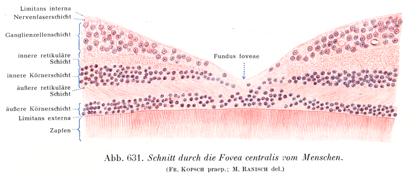 1. 神経線維層Nervenfaserschicht:これは軸索の束からなり,それがグリア細胞によってまとめられている層である.個々の軸索束はたがいに叢状の多数の結合をしている(図633).乳頭より内側ではこの叢が純粋に放射状(経線状)にひろがるが,外側の半分では黄斑がそのような配列を乱す因となっている.乳頭と黄斑のあいだの場所を走る束は黄斑束Maculabündet(日本解剖学会制定の用語では乳頭黄斑束)とよばれ,非常に細くて,乳頭から黄斑へ一部は直線的に走っている.その上方と下方に接する束は,まず放射状に走るが,じきに方向を変えて,上方のものは下方へ,下方のものは上方へむかう.そのさい黄斑束に隣る束は豊富に叢をつくりながら,弓状をなして結合する.残りの束は次第にまた放射状に方向をまげる,中心窩から4mm外側にある小さい1つの三角形をしたところは黄斑傍三角Trigonum paramaculareとよばれ,3つの方向からの線維束が相会するために生じたものである.中心窩においては神経線維層がほぼ完全に欠けている.またこの層は鋸状縁に近づくにつれて次第に束が細くなって,鋸状縁ではこれがなくなっている.