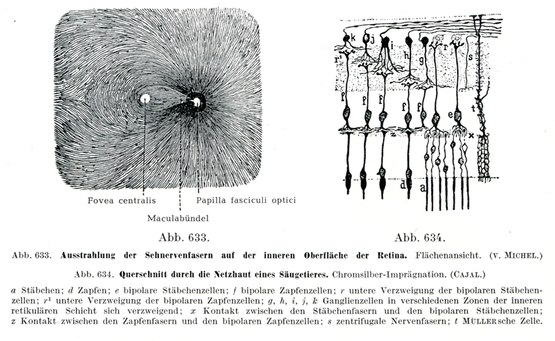 [図633]網膜の内面における視神経線維の放散 網膜の内面からみる.(v. Michel)