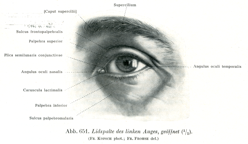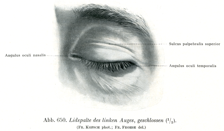 眼を開いているときには(図651),上眼瞼に横走する深い皮膚の溝がとくにはっきり認められる.これは前頭眼瞼溝Sulcus frontopalpebralisとよばれ,眼を閉じているときには浅い溝として見られるにすぎない(図650).これに対応して下眼瞼にあるのが瞼頬溝Sulcus palpebromalarisで,これは下の方を見たときにいっそうはっきりとあらわれる.また上眼瞼の中央を上眼瞼溝Sulcus palpebralis superior,下眼瞼の中央を下眼瞼溝Sulcus palpebralis inferiorが走っている.