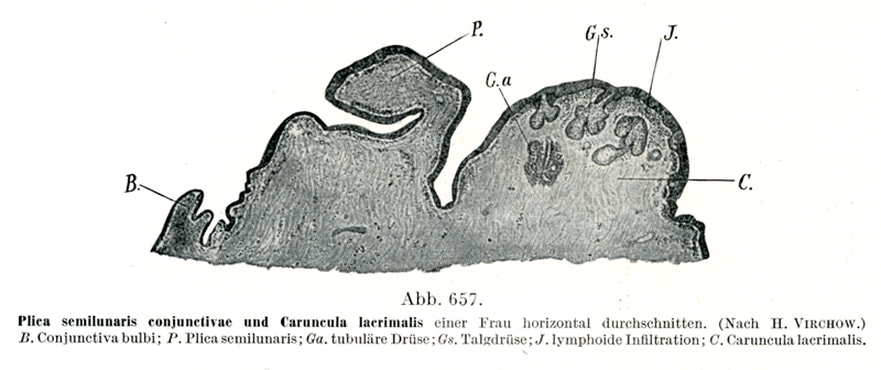 [図657]結膜半月ヒダと涙丘 1婦人のものを水平断 (H. Virchowによる)