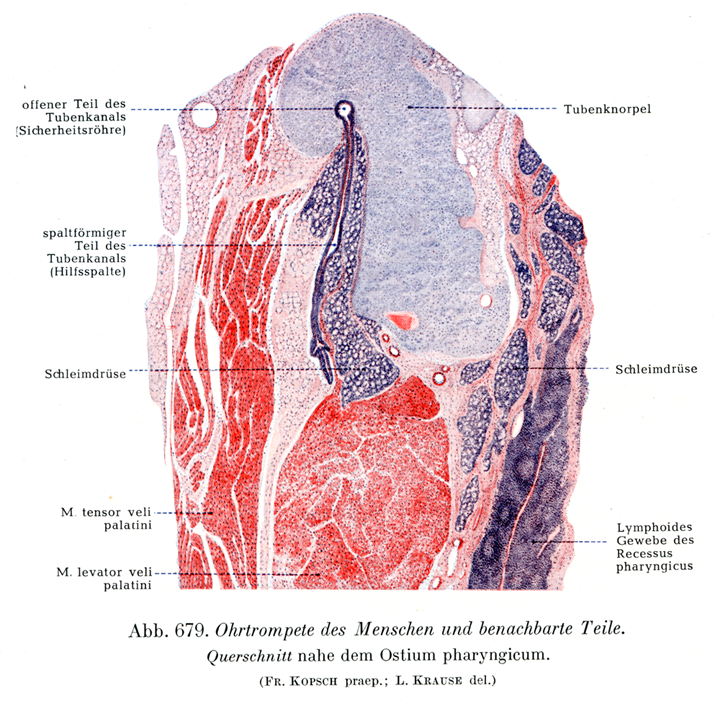 骨部の内腔は血管の充満の程度によるわずかな変化を示す以外は全く動きがない.軟骨部の大部分では線毛をもつ両側壁が相寄っていて,そのため内腔の下部と中部は高さ7mmぐらいの鉛直の裂隙をなしている.しかし裂隙の上部すなわち軟骨のカギの手の部分で囲まれる.ところは,粘膜の表面が軟骨板の曲線に沿ってまるくなっている.そのため内腔の上部は常に開いた管になっており,ここを安全管Sicherheitsröhreとよぶ.そして裂隙の残りの部分は補助隙Hilfsspalteとよばれるのである.しかし軟骨部の前方部では軟骨のカギの手が次第に弱くなり,ついにはなくなってしまうので,粘膜の表面が全体にわたって寄り合っている.補助隙の壁はふだんは相接しているが,口蓋帆張筋が収縮すると,その接触がひき離されうるのである(図679).