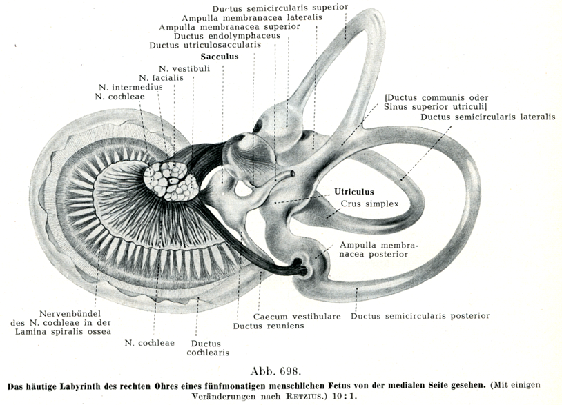 [図698]胎生5カ月の人胎児で右の耳の膜迷路を内側からみる(Retziusによる,多少改変)×10