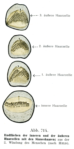 外有毛細胞の列の数には蝸牛管の各回転によって差異がある.すなわち(第1の)底回転では細胞が3列しかないのが普通であって,しかもところどころで細胞が1つ欠けている.(第2の)中回転では第4列が現れるのが普通であるが,そのさい前からあった列の細胞も完全に存在するのではなくて,新しい第4列の細胞と同様に多少の欠員を示す.頂回転では不連続ながら第5列ともいうべき細胞さえ現われる.第5の列は個々ばらばらの少数の細胞からできている.