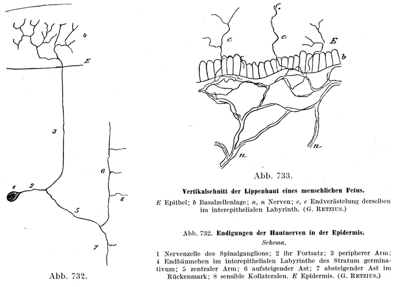 1 脊髄神経節細胞,2 その突起,3 末梢への部分,4 胚芽層の上皮細胞間迷路における終末分枝,5 中枢への部分,6 脊髄内の上行枝,7 下行枝,8 知覚性側枝,E 表皮(G. Retzius)