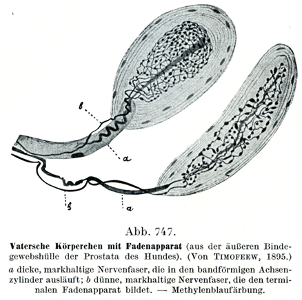 Timofeew(Anat. Anz.,11. Bd.,1895)は層板小体のなかにある特別な糸状装置Fadenapparatを記載した.各小体にはふつう2本の有髄神経線維が到来し,その1つは無髄の扁平な軸索となって内棍に入りこむ.第2の神経線維は第1のものと並んではいり,そこで髄鞘を失って,1つの注目すべき網目の細かい糸状装置に移行する.この装置は何度もまがって走るごく細い糸からなり,孔のあいた鞘のかたちに第1の線維のリボン状の軸索を包み,そのさいこれと接触することがなく,ましてや吻合することもない(図747).両線維は異なった神経細胞から来ているもののようである.Stefanelli(Monit. zool. ita1., 48. Bd.,1937)はこの糸状装置が副交感性のものであるというが,Stöhr jr. (Z. Zellforsch., 30. Bd.,1939)によればこのことは今日までのところ確証されていない.