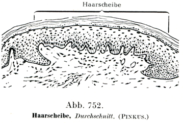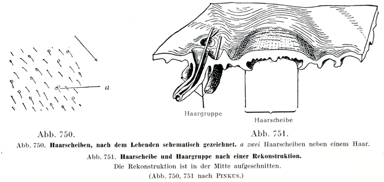 [図750]生体の毛盤を模型的に示す(Pinkus). a 2つの毛盤が1本の毛のわきにある.