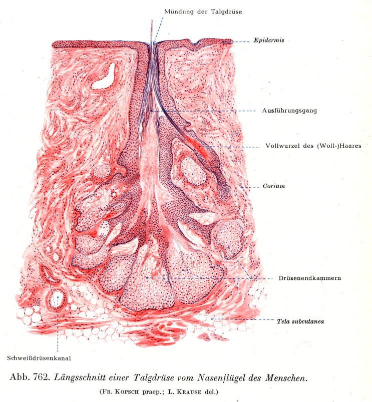 分泌がつづくと脂肪はついに開口の外へ押し出されて,毛や周辺の皮膚をしつとりうるおすのである.平滑筋である毛包筋Haarbalgmuskeln(=立毛筋)もその収縮によって脂肪の排出を促進する.