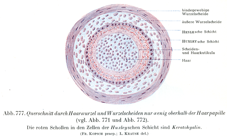 [図777]毛乳頭のわずかに上方で毛根と根鞘を横断(図771と図772を参照)
