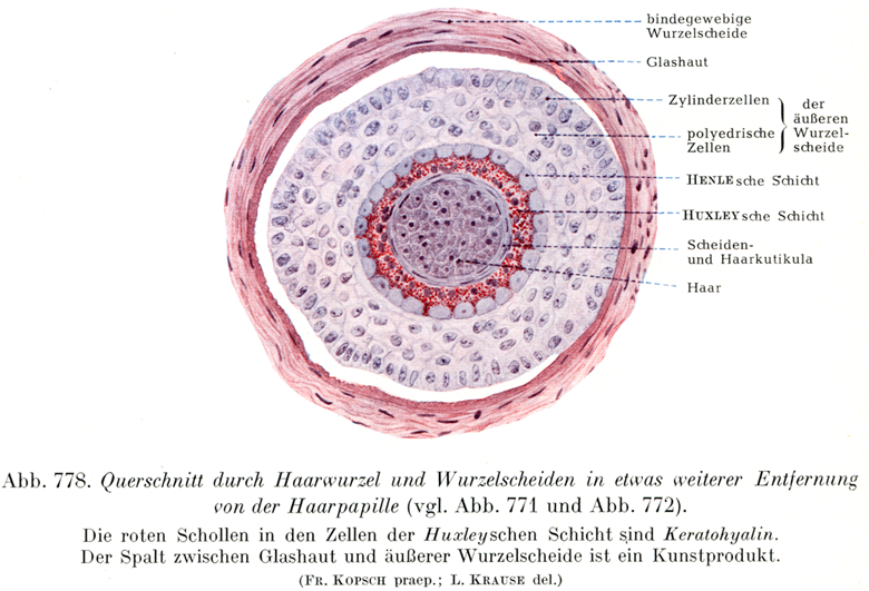 [図778]毛乳頭からさらに少しはなれたところで毛根と根鞘を横断(図771と図772を参照)