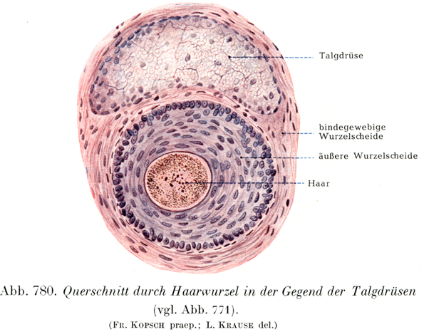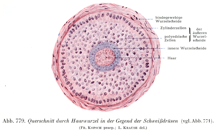 毛の色についてはなお白髪化Ergrauenという現象が残っている.白髪化は動物界および植物界では大きな役割を演じるものであって,ヒトの場合と違って必ずしも老年現象ではない.(白髪化の問題を統計的に追求した最近の研究として,H. Terada:Appearance of gray hair, as an aging phenomenon in Japanese. Fol. anat. jap. 28.1956がある.(小川鼎三))この現象はまず上皮細胞が含気上皮Aëroepithelに変化すること,すなわち空気が上皮細胞間迷路および上皮細胞じしんの内部に侵入することによって起る.この変化は毛が形成されるときに,毛根のところだけで起りうることなので,皮膚の外に出ている毛の部分が一朝にして白髪になるというようなことは,とても真実とは思われない(Stieda, Dtsch, med. Wschr.,1910).しかしHoepke(Z. ges. Anat., 61. Bd.,1921)によれば突然の白髪化は否定できないという.