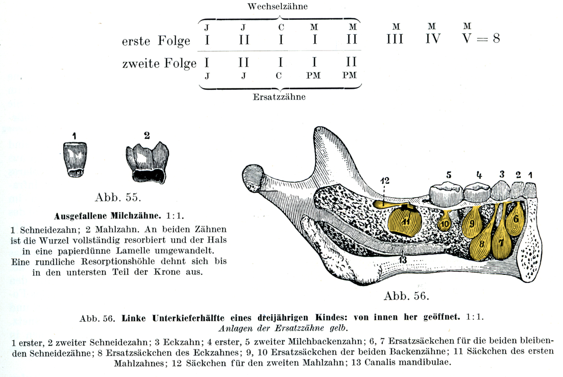 1と2 内側と外側切歯;3. 犬歯;4と5第1と第2大臼歯(ともに乳歯);6と7内外両側切歯の代生歯小嚢;8犬歯の代生歯小嚢;9と10第1と第2小臼歯の代生歯小嚢;11 第1大臼歯(永久歯)の歯小嚢;12 第2大臼歯(永久歯)の歯小嚢;13 下顎管.