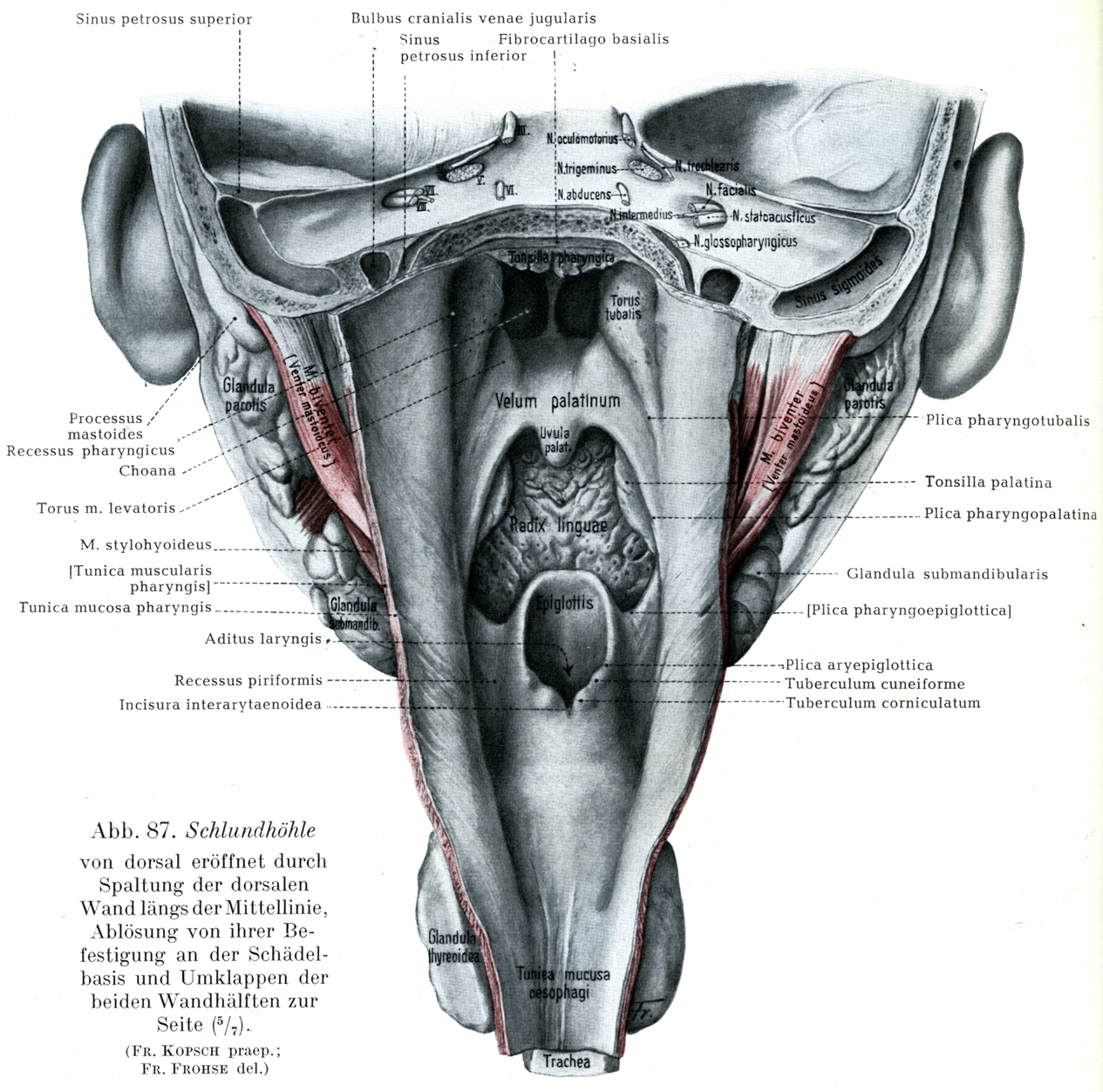 咽頭の後壁を正中線に沿って切り,壁が頭蓋底に固着するとこうを剥がして,左右両半の咽頭壁を側方にひるがえしてある(