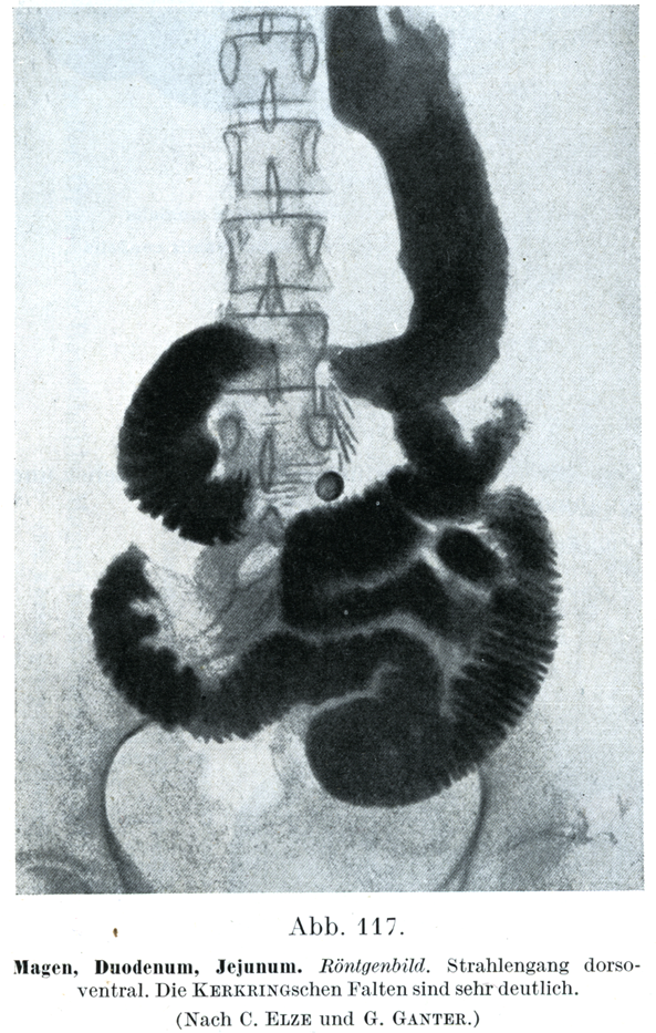 レントゲン像背腹方面の照射.ケルクリソグヒダがはなはだ明瞭にみえる.(C. ElzeとG. Ganterによる)