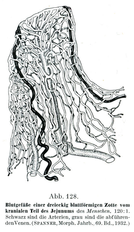[図128]ヒトの空腸の上部における三角形の花弁状を呈する1個の絨毛内の血管×120.黒は動脈,灰色は血液を他にみちびく静脈.(Spanner, Morph. Jahrb., 69. Bd.,1932)