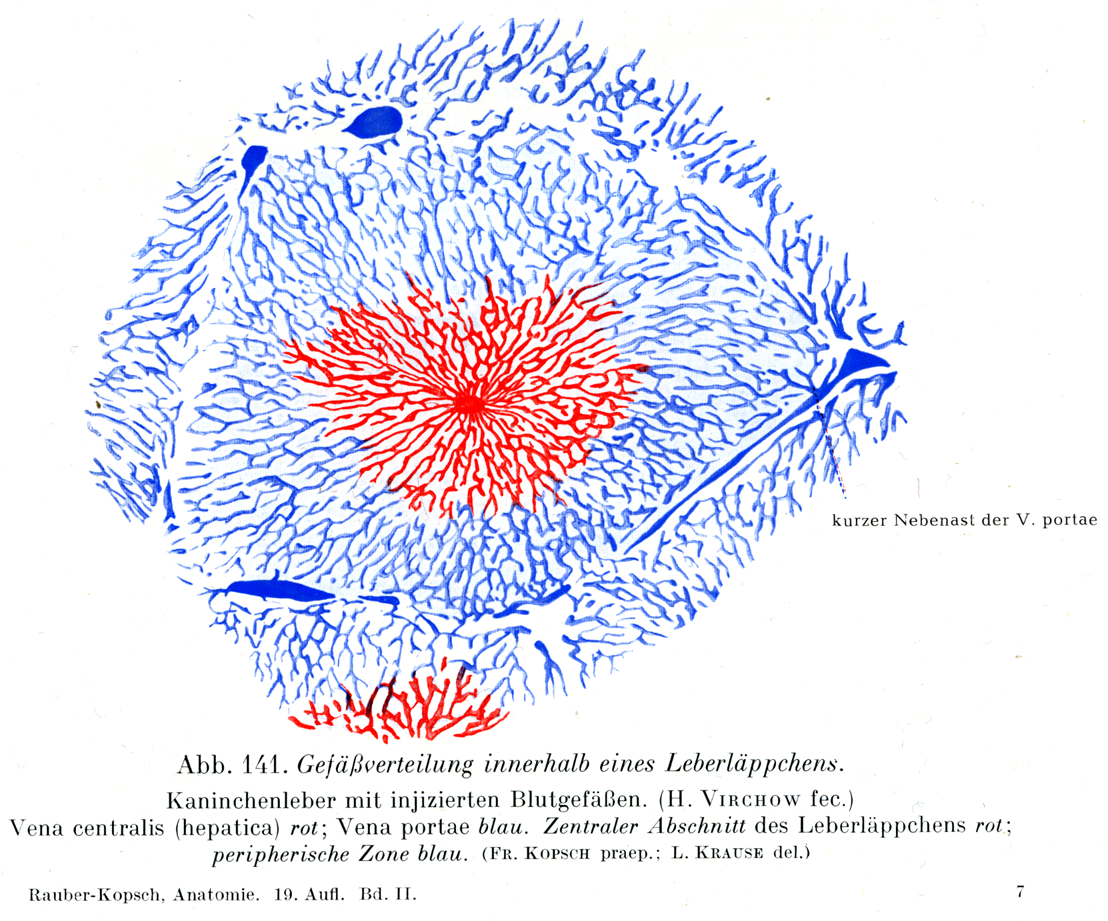 [図141]1個の肝小葉内の血管分布 血管に注入した家兎の肝臓(C. Virchow作),中心静脈(肝静脈)は赤,門脈は青.肝小葉の中心部が赤で,辺縁部が青である.