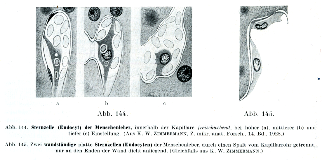 [図145]壁に付いている扁平な2個の星細胞 ヒトの肝臓.せまい隙間により毛細管の内面から離れていて,両端のところだけ壁に密接している.(これもK. W. Zimmermannによる)
