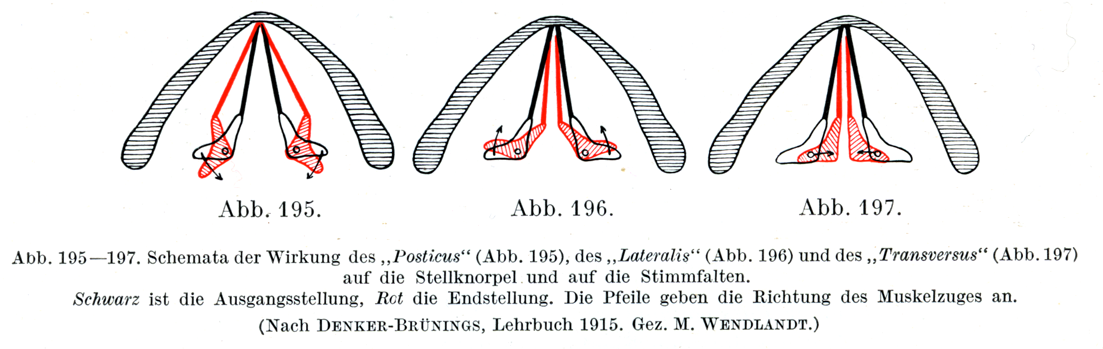 [図195~197]“Posticus”(図195)“Lateralis”(図196)“Transversus”(図197)が披裂筋と声帯ヒダに対して如何に作用するかを示す模型図 黒は始めの位置,赤は終りの位置,矢印は筋の引く力の方向を示す.(Denker-Brünings Lehrbuch 1915による)