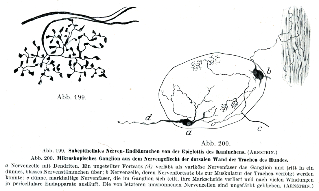 a 樹状突起をもつ神経細胞.枝分れしない突起(d)は瘤状の部分をもつ線維variköse Nervenfaserとして神経節を出て色の薄い細い神経小幹にいたる;b 神経細胞でその神経突起は気管の筋肉まで追求できた;c 細い有髄神経線維,神経節のなかで枝分れして髄鞘を失い著しくうねってから細胞周囲の終末装置に終る.この終末装置によって取り囲まれた神経細胞は染まっていない(Arnstein).