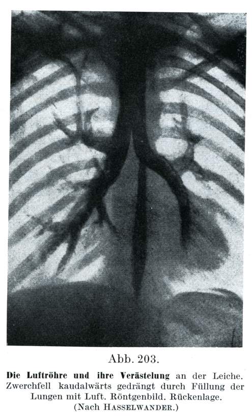 横隔膜は塑気で充された肺によって下方に押しやられている.レントゲン写真.背位(Haßelwanderによる)