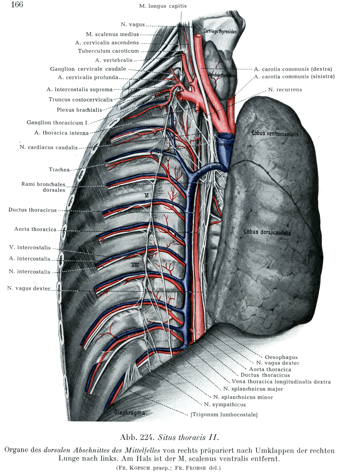 後縦隔の諸器官を右側から剖出してある.右肺は左の方に折り返してある.頚部では前斜角筋を取り除いてある.