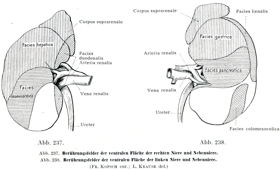 右の腎臓と腎上体の前面における他の諸器官との接触面
