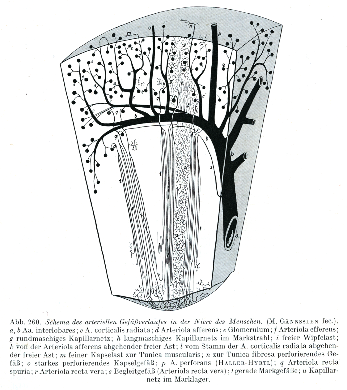 a, b 葉間動脈;c 放線状皮質動脈;d 輸入細動脈;e 糸球体;f 輸出細動脈 g 丸い網目をもつ毛細管網;h 髄放線の長い網目をもつ毛細管網;i 糸球体と関係なく終る細小枝freier Wipfelast; k 輸入細動脈から出る枝で糸球体と関係のないもの;l 放線状皮質動脈の幹から出る枝で糸球体と関係のないもの; m 筋質膜に向う細い被膜枝;n 穿通して線維被膜に達するもの;o 貫通する太い被膜の血管;p穿通動脈(Haller--Hyrtl);q 仮性直細動脈;r 真性直細動脈;s 伴行血管(真性直細動脈);t 髄質の直走する血管;u 髄質内の毛細管網.