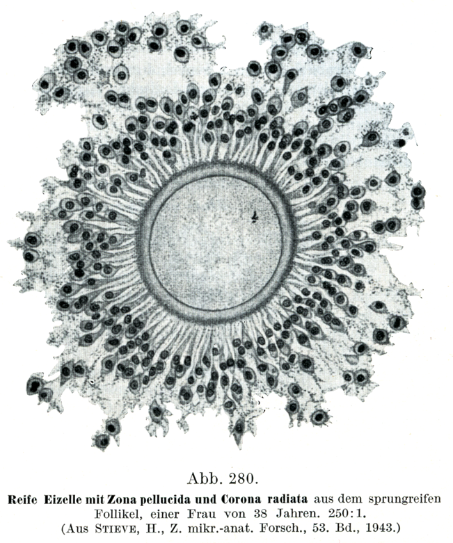 [図280]透明帯と放線冠をもった成熟卵 破裂直前の卵胞のもの,38才の女.×250 (Stieve, H., Z. mikr.-anat. Forsch., 53. Bd.,1943による)