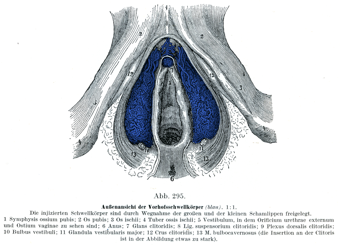 1. 恥骨結合;2. 恥骨;3. 坐骨;4. 坐骨結節;5. 腔前庭(外尿道口と腔口がみえる);6. 肛門;7. 陰核亀頭;8. 陰核提靱帯;9. 陰核背静脈叢;10. 前庭球;11. 大前庭腺;12. 陰核脚;13. 球海綿体筋(陰核への停止は少し強調して画いてある).