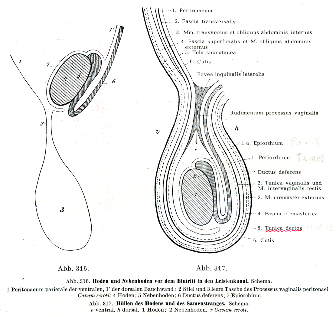 v 前, h 後,1精巣:2精巣上体:r陰嚢腔.