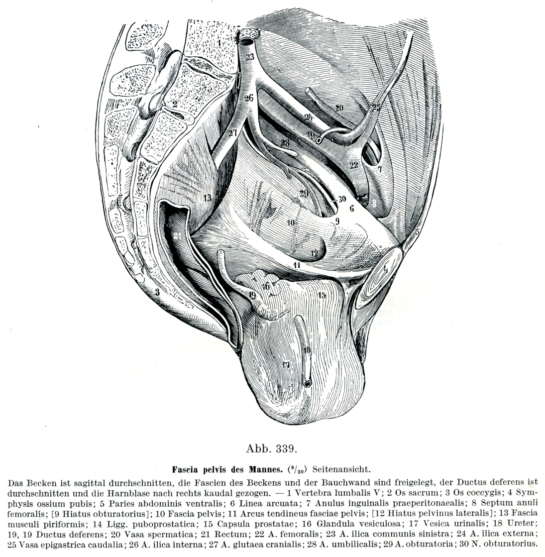 骨盤を矢状断した上で骨盤および腹壁の筋膜を剖出してある.精管は切断してあり,膀胱は右下方に引き下げてある.1 第5腰椎;2 仙骨;3 尾骨;4 恥骨結合;5 前腹壁;6 弓状線;7 腹膜下鼡径輪;8 大腿動脈輪中隔;[9 閉鎖筋裂孔];10 骨盤筋膜;11 骨盤隔膜腱弓;[12 外側骨盤裂孔];13 梨状筋膜;14恥骨前立腺靱帯;15 前立腺被膜;16精嚢腺;17 膀胱;18 尿管;19 精管;20 精巣動静脈;21直腸;22 大腿動脈;23 左総腸骨動脈;24 外腸骨動脈;25 下腹壁動静脈;26 内腸骨動脈;27上臀動脈;28 膀動脈;29 閉鎖動脈;30閉鎖神経.