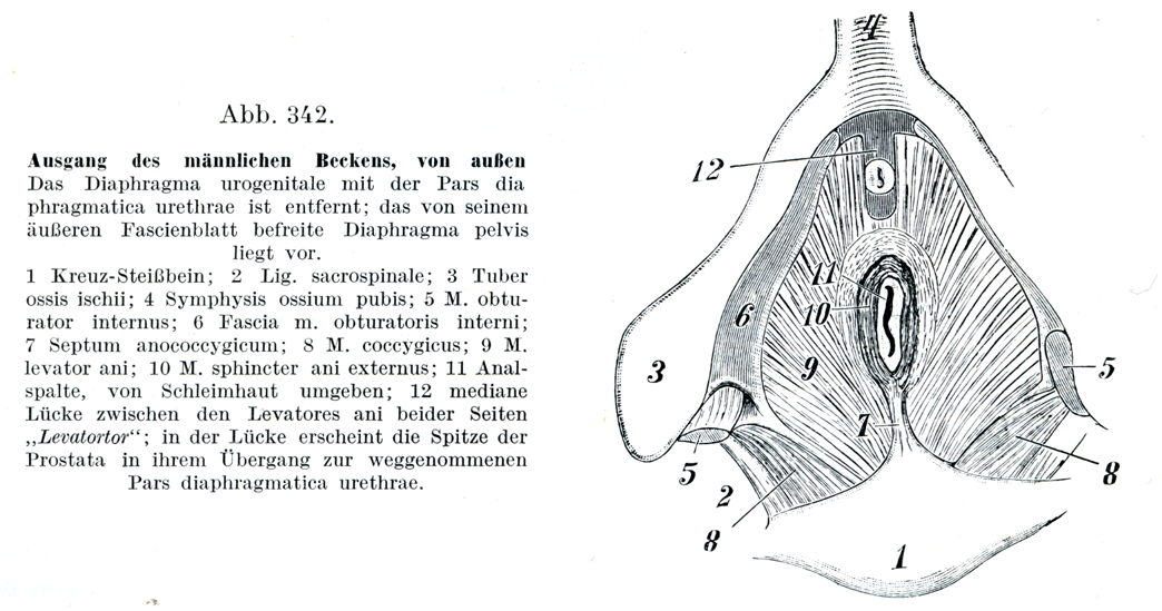 1 仙尾骨;2 仙棘靱帯;3 坐骨結節;4 恥骨結合;5 内閉鎖筋;6 内閉鎖筋膜;7 肛門尾骨中隔;8 尾骨筋;9 肛門挙筋;10外肛門括約筋;11肛門裂;粘膜によって囲まれている;12両側の肛門挙筋のあいだにある正中部め隙間,すなわち“挙筋門Levatortor”;この隙間には前立腺の尖端が尿道の隔膜部(これは取り除いてある)に移行するところがみえる.