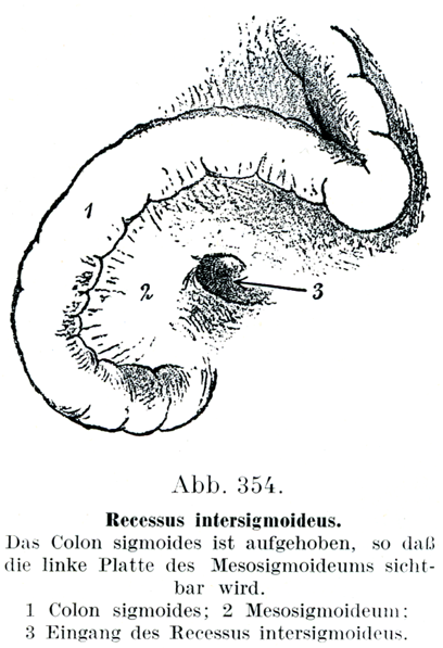 [図354]S状結腸間陥凹 S状結腸を上方にあげて,S状結腸間膜の左側板がみえるようにしてある.1 S状結腸;2 S状結腸間膜;3 S状結腸間陥凹の入口.