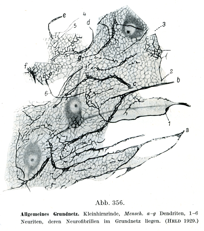 ヒトの小脳皮質.a~g樹状突起,1~6 神経突起(軸索突起),その神経原線維は基礎網のなかにある.(Held,1929)