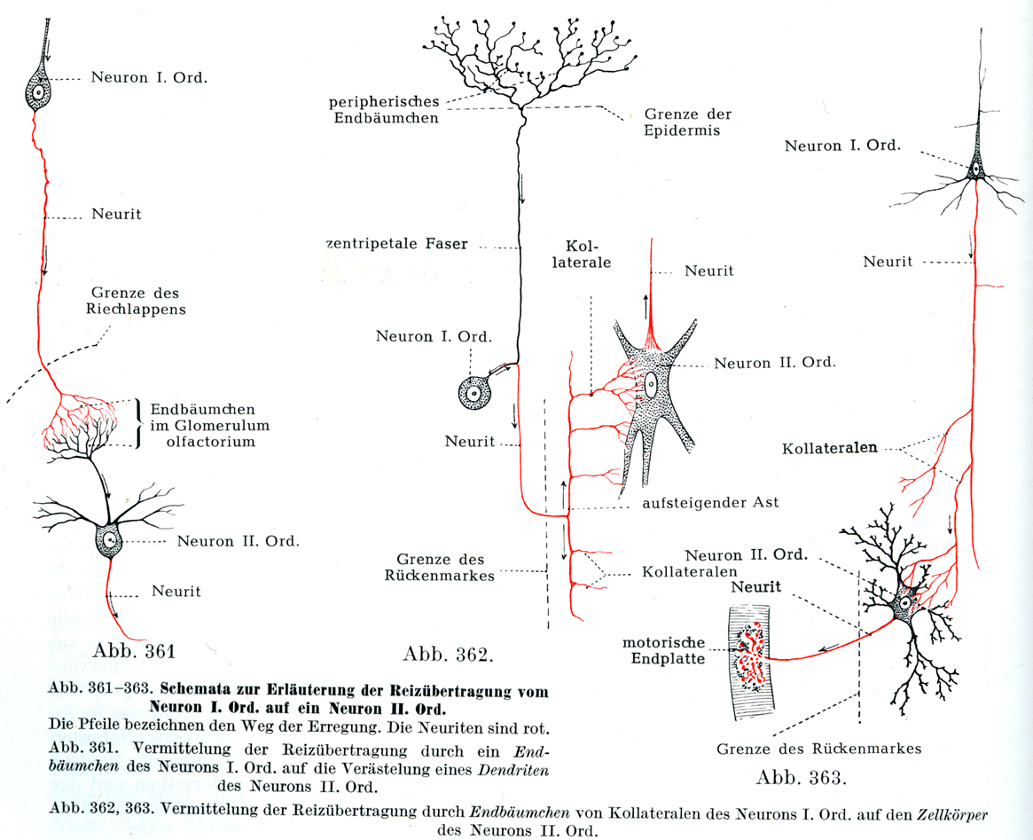 [図361~363]刺激が一次ニューロンから二次ニューロンに伝わる具合を示す模型図 矢印は興奮の伝つてゆく路を示す,神経突起は赤色.図361.一次ニューロンの終末分枝によって二次ニューロンの樹状突起の枝への刺激伝達が仲介されている.図362, 363.一次ニューロンの側枝の終末分枝によって二次ニューロンの細胞体への刺激伝達が仲介されている.