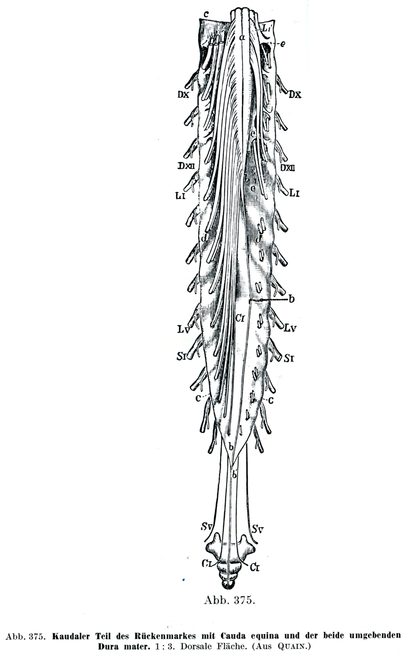 [図375]脊髄の下部と馬尾およびこの両者を取り巻く硬膜(1/3)後面(Quainより)
