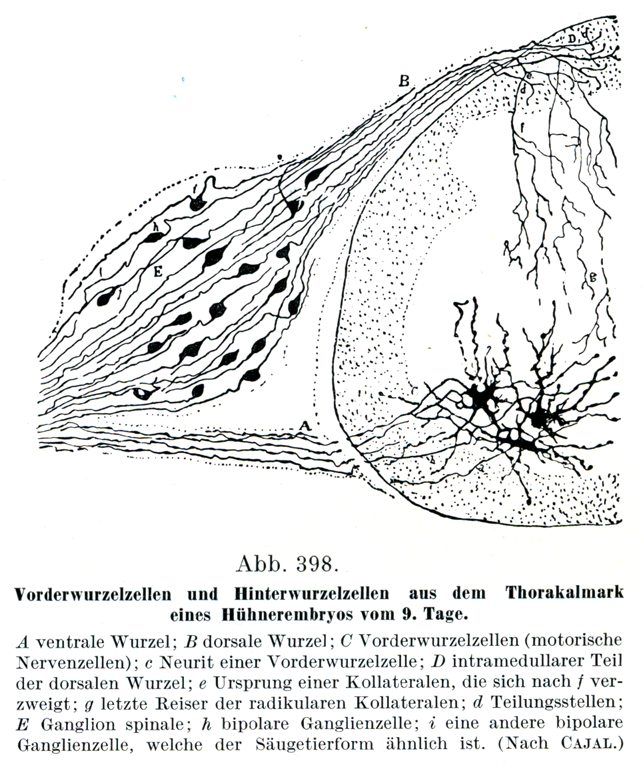 A 前根;・B 後根;C 前根細胞(運動性神経細胞);C 前根細胞の神経突起;D 後根の脊髄内にある部分;e 1本の側枝の起始部,この側枝は!に向かって枝分れしている;g 根線維の側枝からつづく最後の小枝;d 分岐部;E 脊髄神経節;h 双趣神経細胞;i もう1つ別の双極神経細胞であって,これは哺乳類形に似ている(Cajalによる).